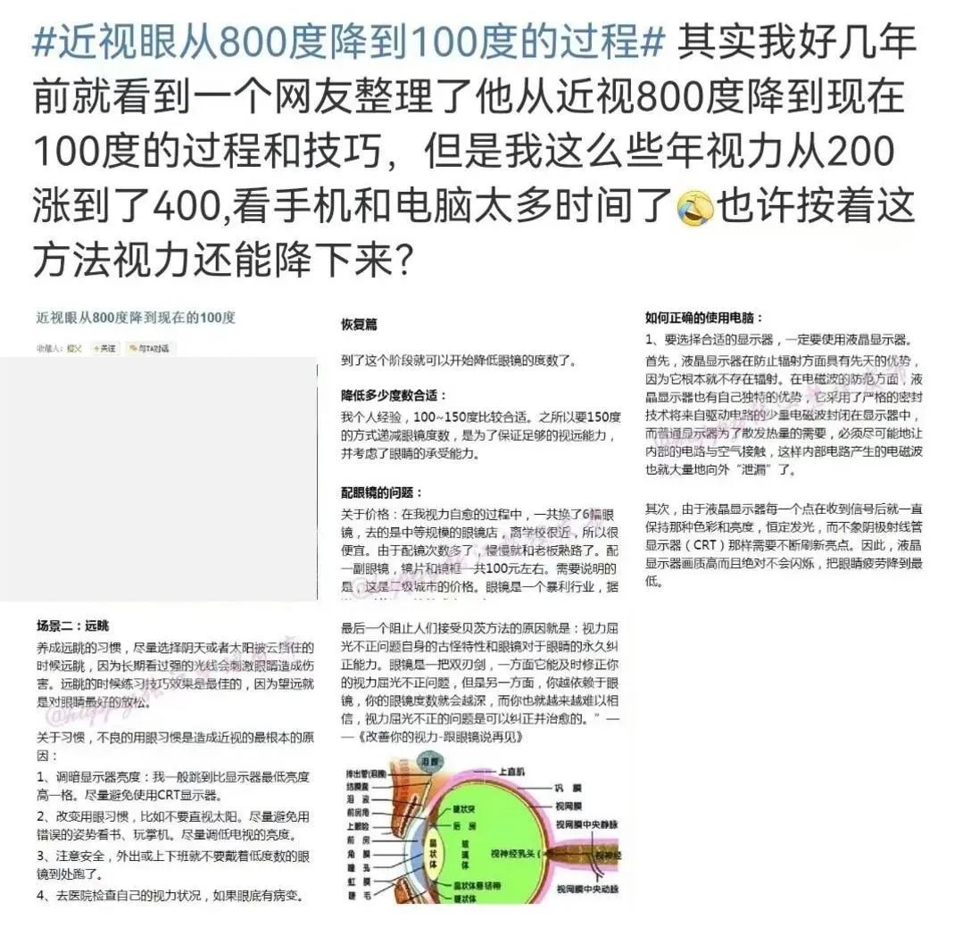 【文章導讀】前陣子 #近視眼從800度降到100度的過程# 高掛熱搜,引發(fā)眾多關注 話題中 博主分享了一位25歲近視患者 通過一套視力恢復操 零成本從800度降低到100度的過程 文中內(nèi)容看似干貨滿滿、很