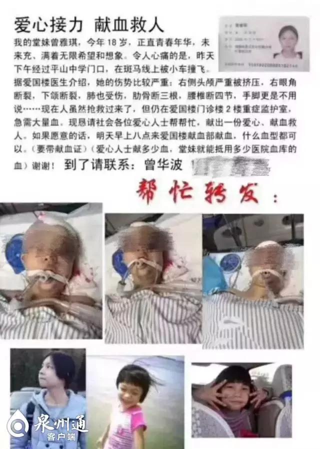 雅琪手術(shù)后第二天,一場(chǎng)關(guān)于她的愛(ài)心接力在朋友圈傳開(kāi)了,一條“愛(ài)心接力獻(xiàn)血救人——晉江少女曾雅琪不幸遭遇車(chē)禍”的求助信息被眾人轉(zhuǎn)發(fā)。