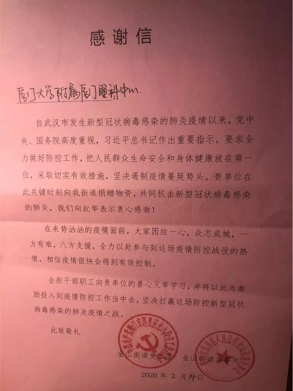 在中華街道辦,街道在LED大屏上打上了“感謝廈門大學(xué)附屬?gòu)B門眼科中心向中華街道捐贈(zèng)護(hù)目鏡”;廈港街道辦為醫(yī)院頒發(fā)了榮譽(yù)證書;還有湖里街道辦、金山街道辦等街道也寫了一封封誠(chéng)摯的感謝信。