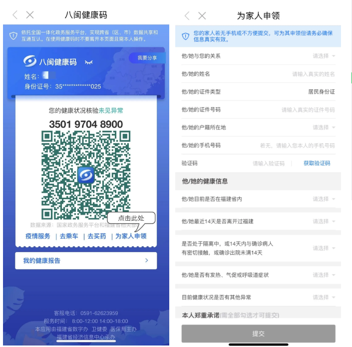 用戶實(shí)名登錄閩政通APP—進(jìn)入“八閩健康碼”服務(wù)—選擇“為家人申領(lǐng)”—按要求填寫家人身份信息和健康信息。