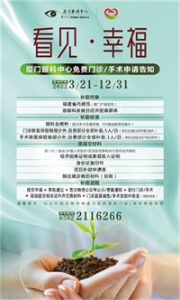 眼睛是心靈之窗,眼健康是國民健康的重要組成部分,也是反映人民群眾健康和幸福指標(biāo)的一面鏡子。為深化落實(shí)“愛心廈門”行動及內(nèi)涵,提升人民群眾的獲得感、幸福感、安全感,滿足普遍、多樣的眼健康需求,2022年3月21日至12月31日,廈門眼科中心暖心啟動2022年“看見幸福”眼健康愛心公益項(xiàng)目,聚焦弱勢群體及重點(diǎn)眼病的困難救治,凡符合條件的患者均可申請專項(xiàng)愛心公益補(bǔ)助。